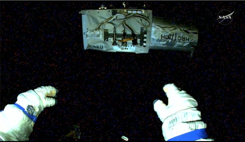 Russian cosmonaut Aleksei Zubritsky discards a defunct camera from the ISS during his 6+ hour spacewalk.