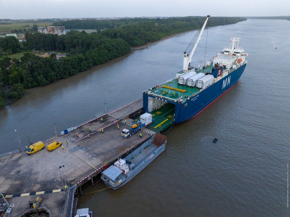 PICTURE: ESA’s SMILE spacecraft arrives at the European Spaceport in French Guiana after a transatlantic crossing. The Solar wing Magnetosphere Ionosphere Link Explorer is poised for launch between 8 April and 7 May on a Vega-C rocket.